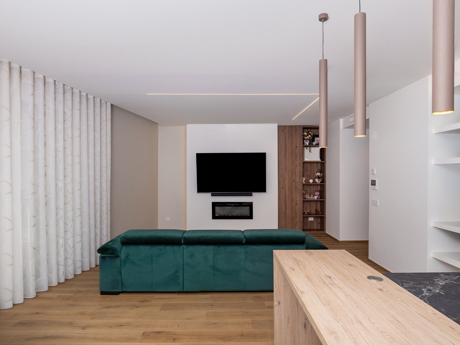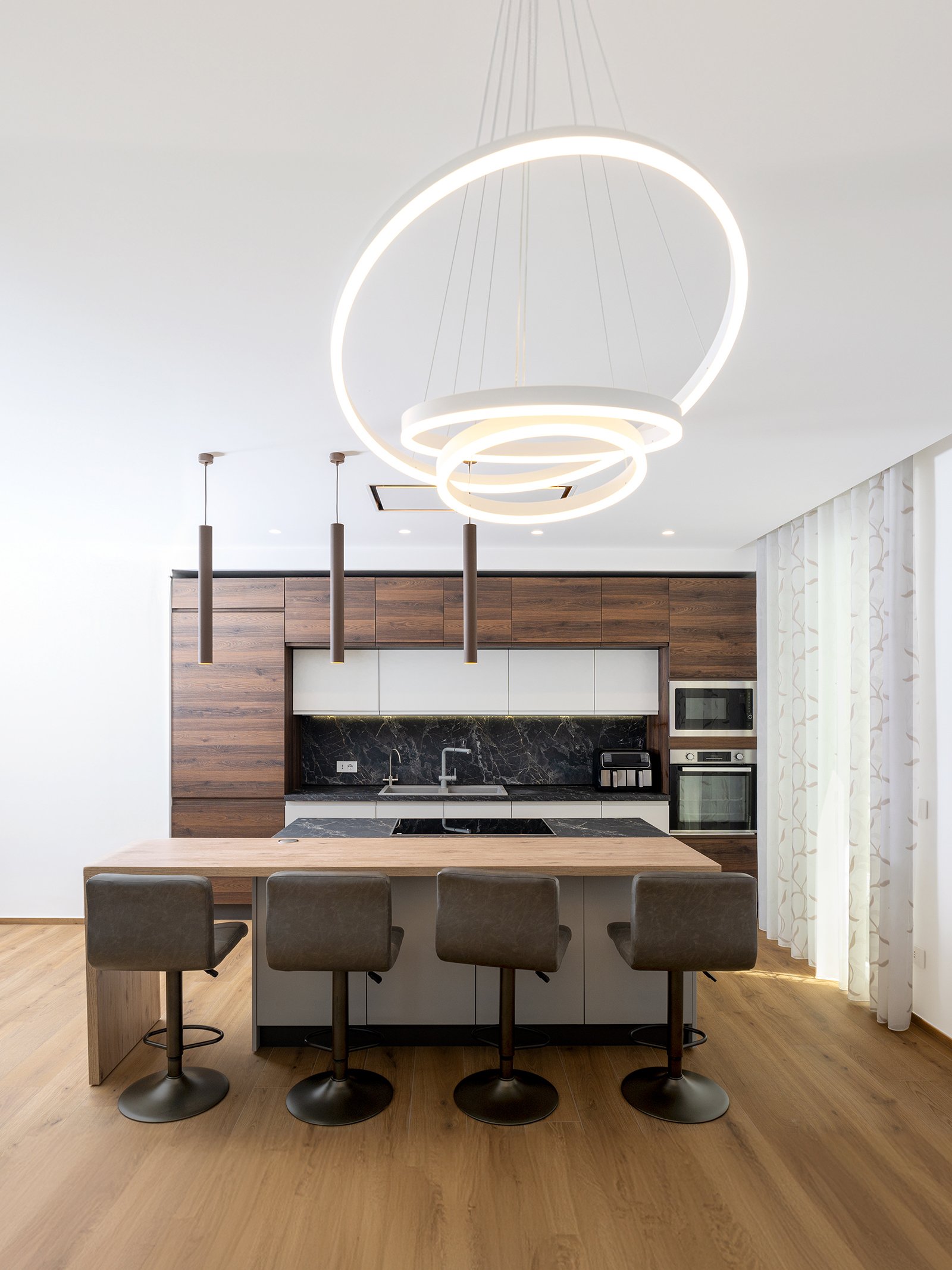 Un ampio e luminoso open space accoglie la cucina e il soggiorno, creando un ambiente accogliente e conviviale. L’isola centrale funge da punto focale, mentre i materiali naturali e i toni neutri conferiscono un’atmosfera contemporanea e rilassante.