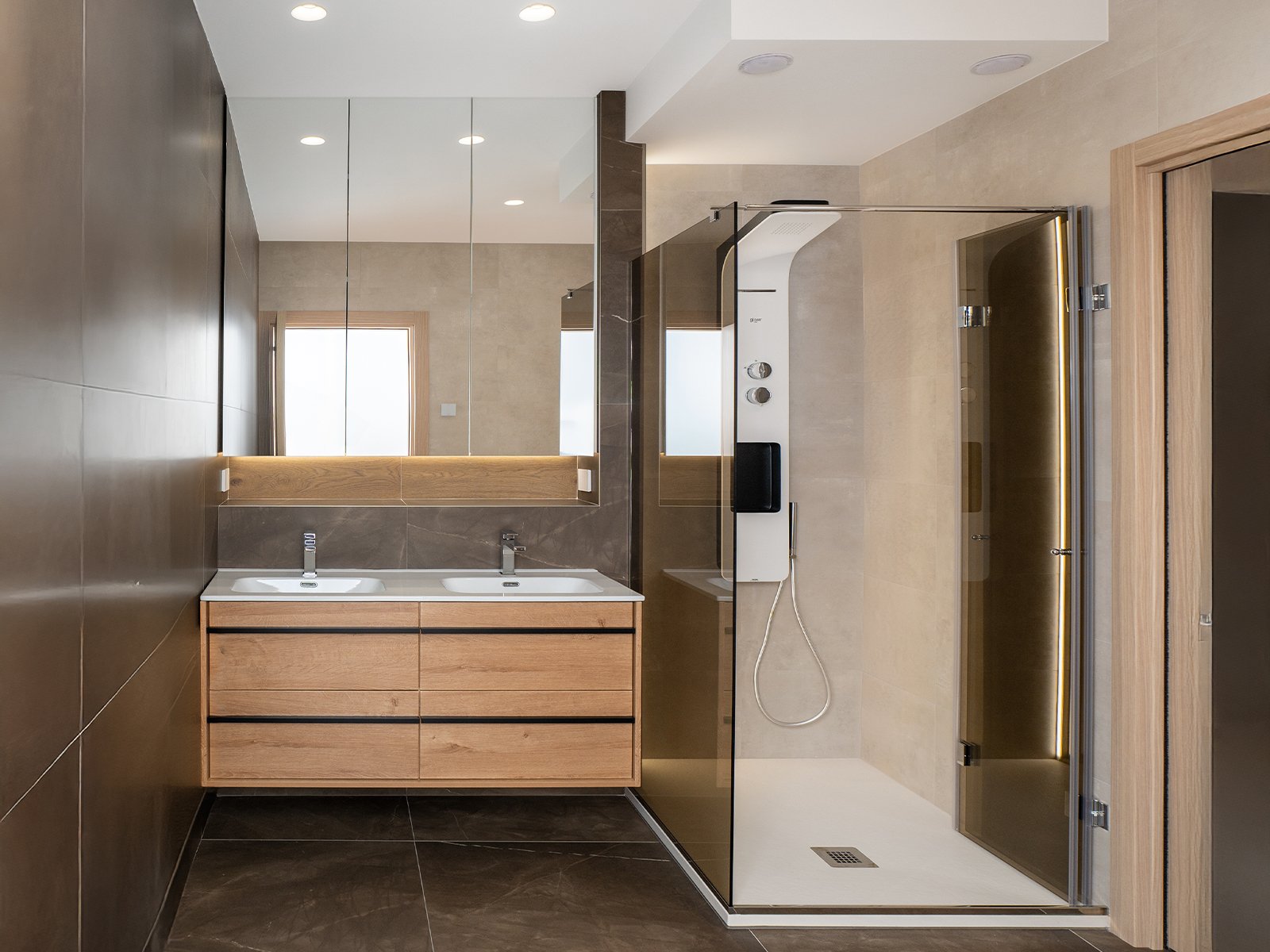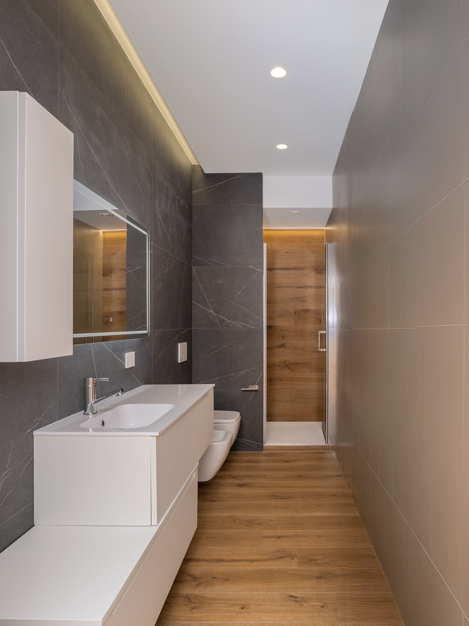 I due bagni sono stati pensati per essere funzionali e raffinati, linee pulite, colori neutri e materiali essenziali creano un’atmosfera serena e senza fronzoli.