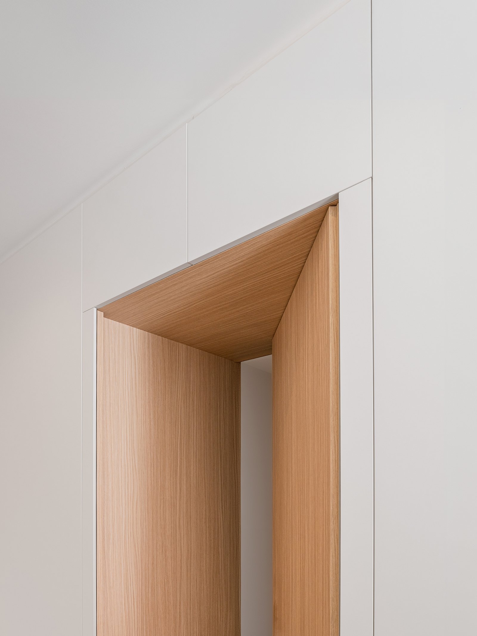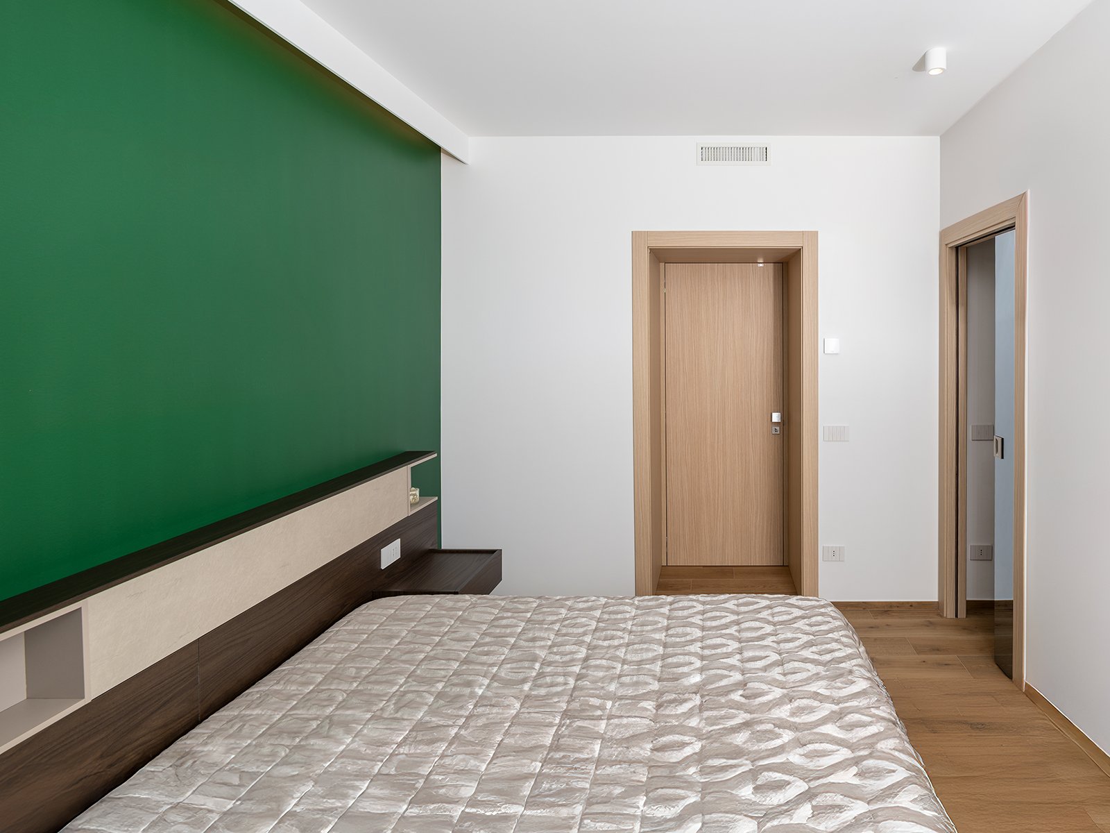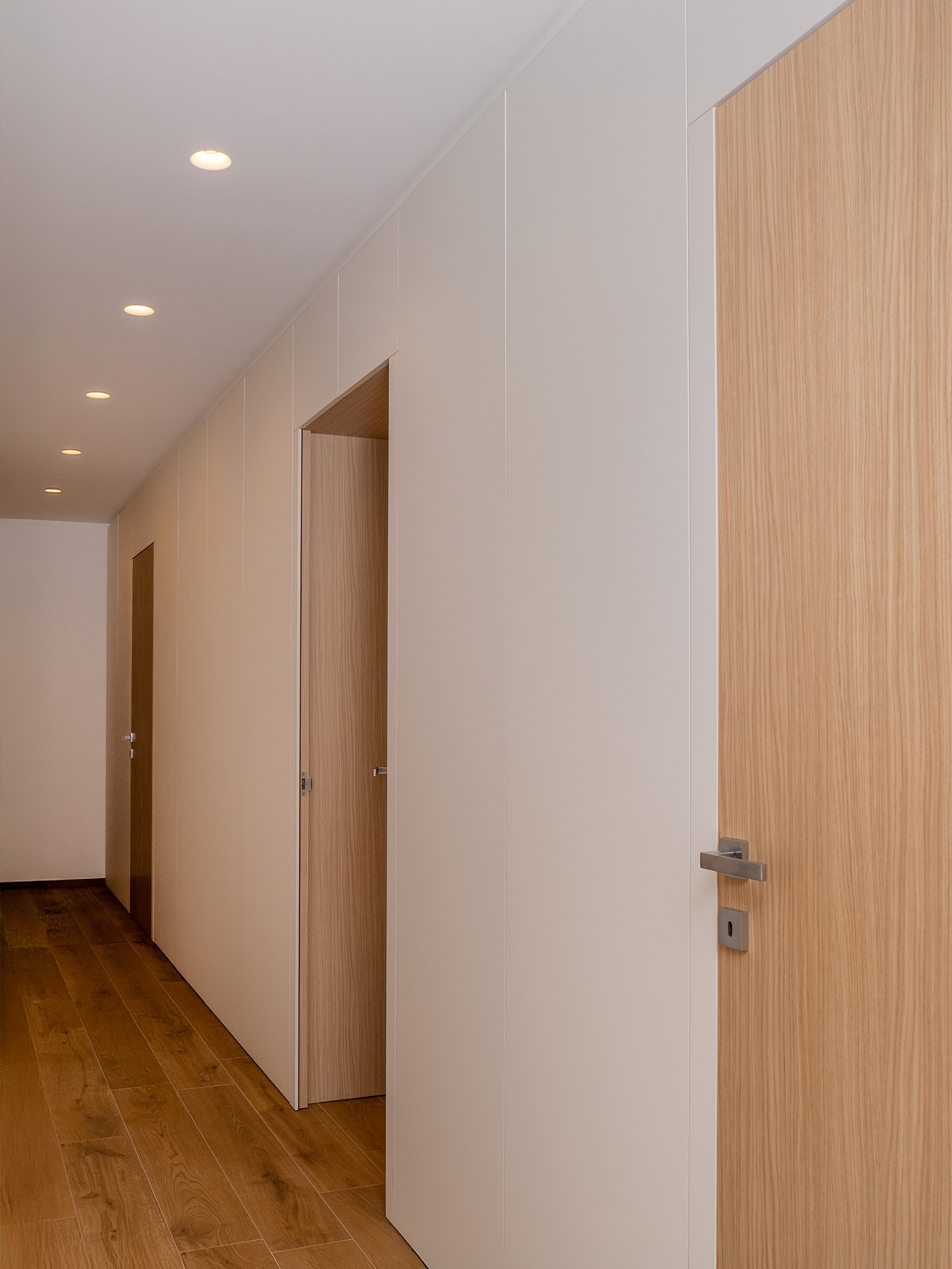 L’ampio corridoio è stato sfruttato con un armadio a parete progettato su misura per offrire spazio contenitivo e integrare le porte di accesso alle varie camere da letto.